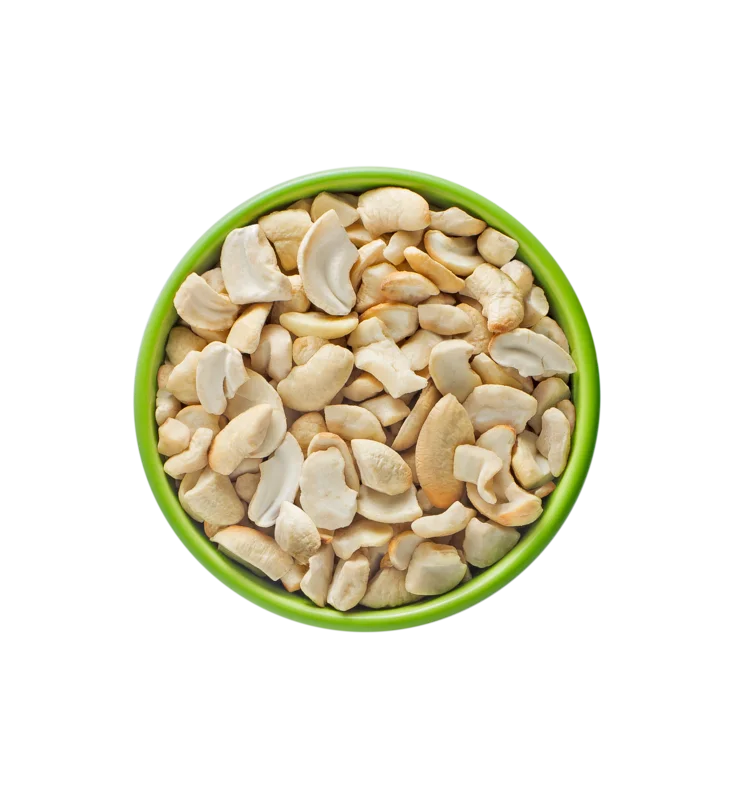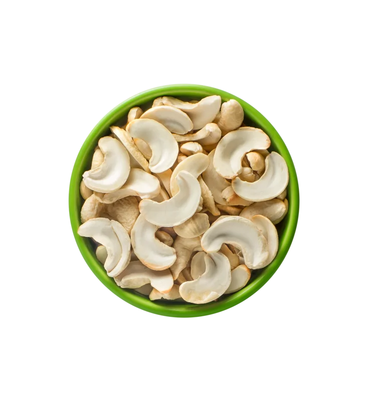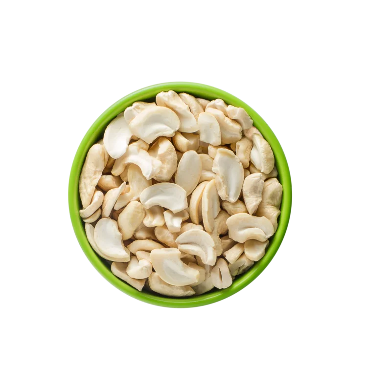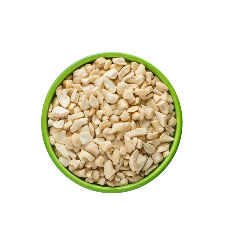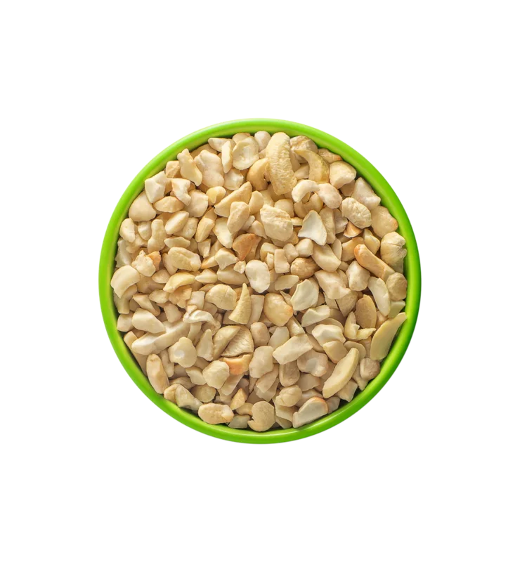 Whole cashews diced into eight pieces, typically used as toppings, coatings in food applications, and as thickeners for sauces and curries.