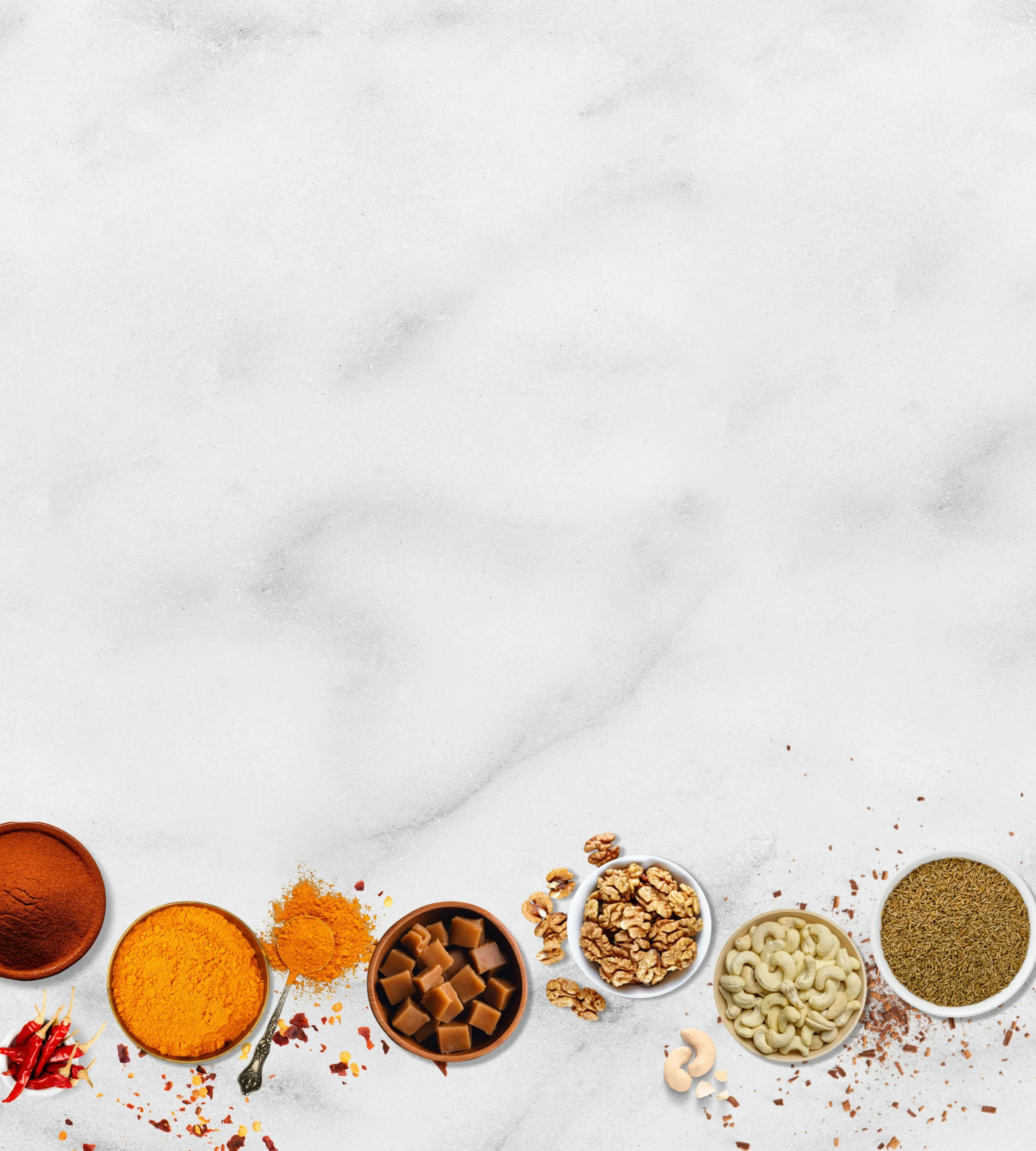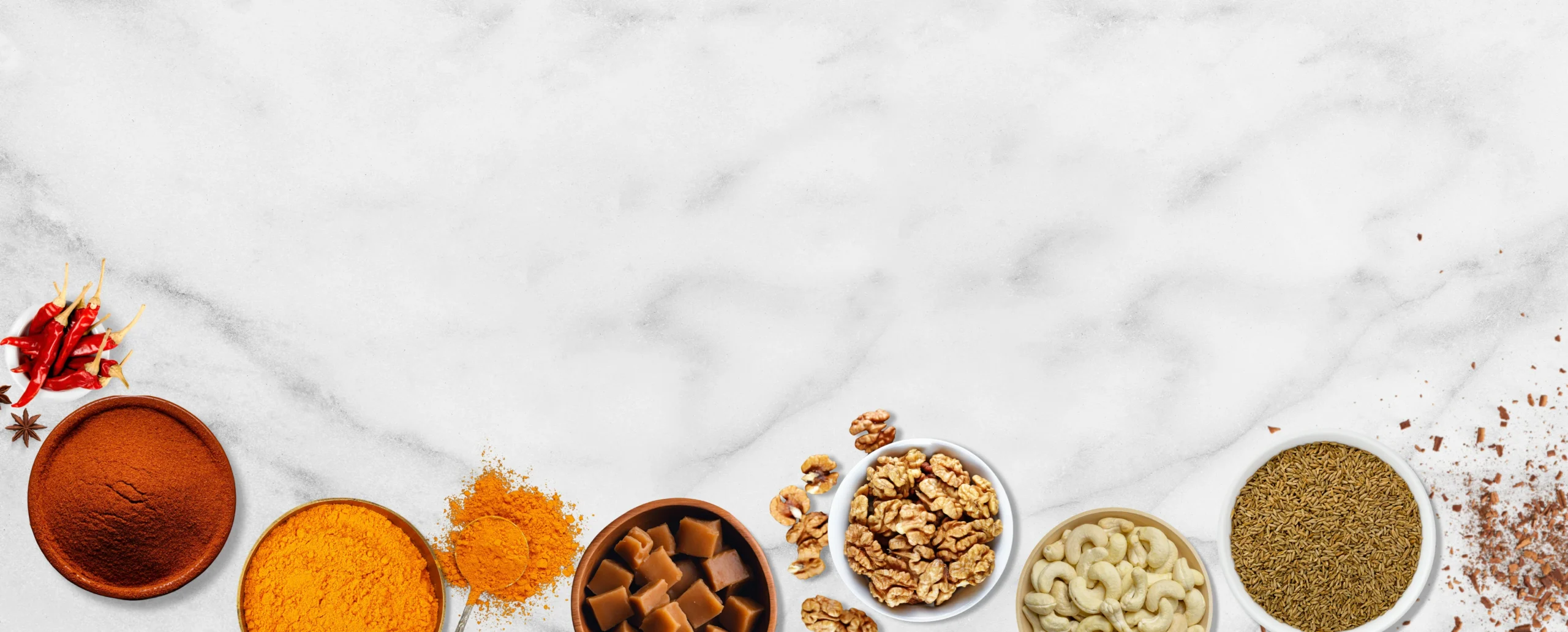 Showcase the variety of products available for bulk purchase, including cashews, walnuts, jaggery, red chili, cumin seeds, and turmeric.